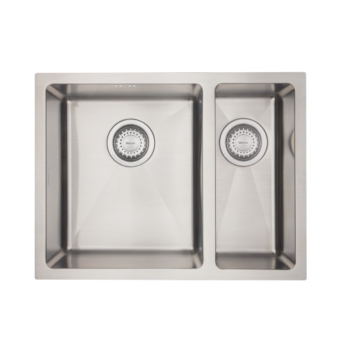The DV Brighton 1 & ¼ double bowl sink has a 15mm corner radius and comes standard with a 90mm round basket waste, sound deadening and 15l/m overflow.
