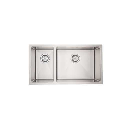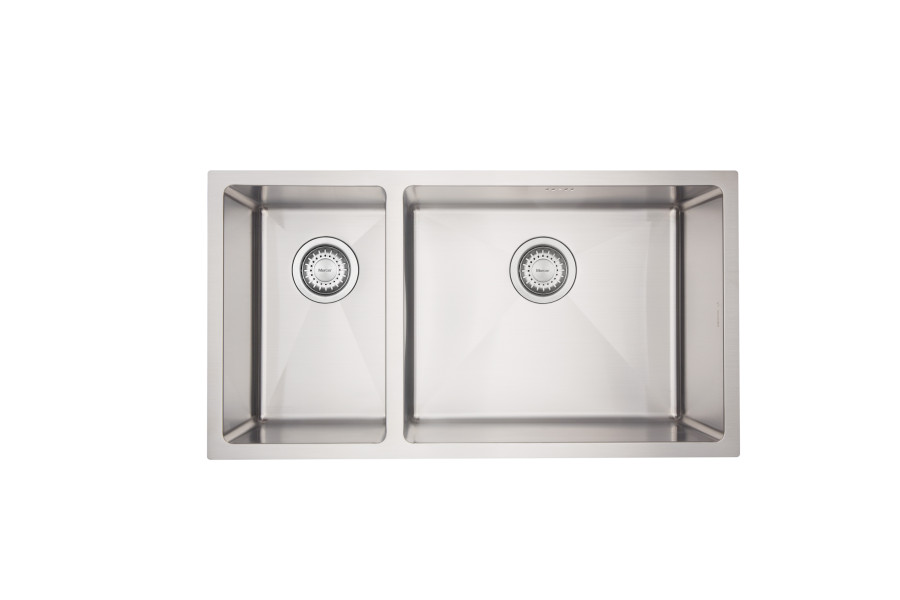 The DV Burlington 1 & 1/2 double bowl sink has a 15mm corner radius and comes standard with a 90mm round basket waste, sound deadening and 15l/m overflow.