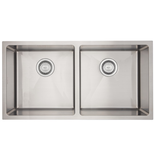 The DV Dorset double bowl sink has a 15mm corner radius and comes standard with a 90mm round basket waste, sound deadening and 15l/m overflow.