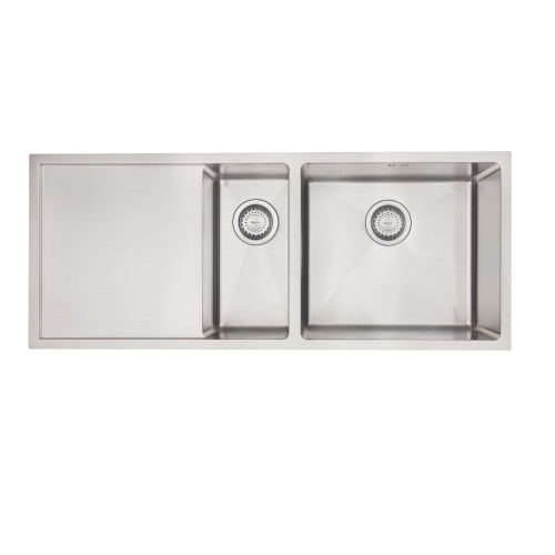 The DV Sheffield 1 & 1/4 double bowl and drainer has a 15mm corner radius and comes standard with a 90mm round basket waste, sound deadening and 15l/m overflow.